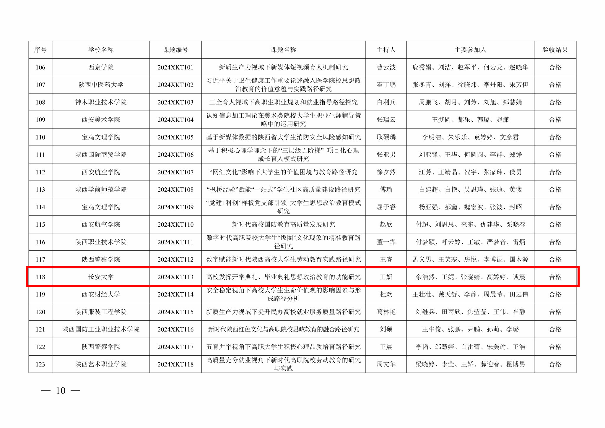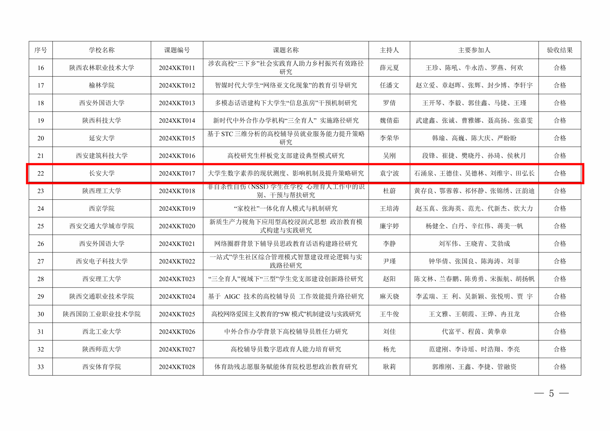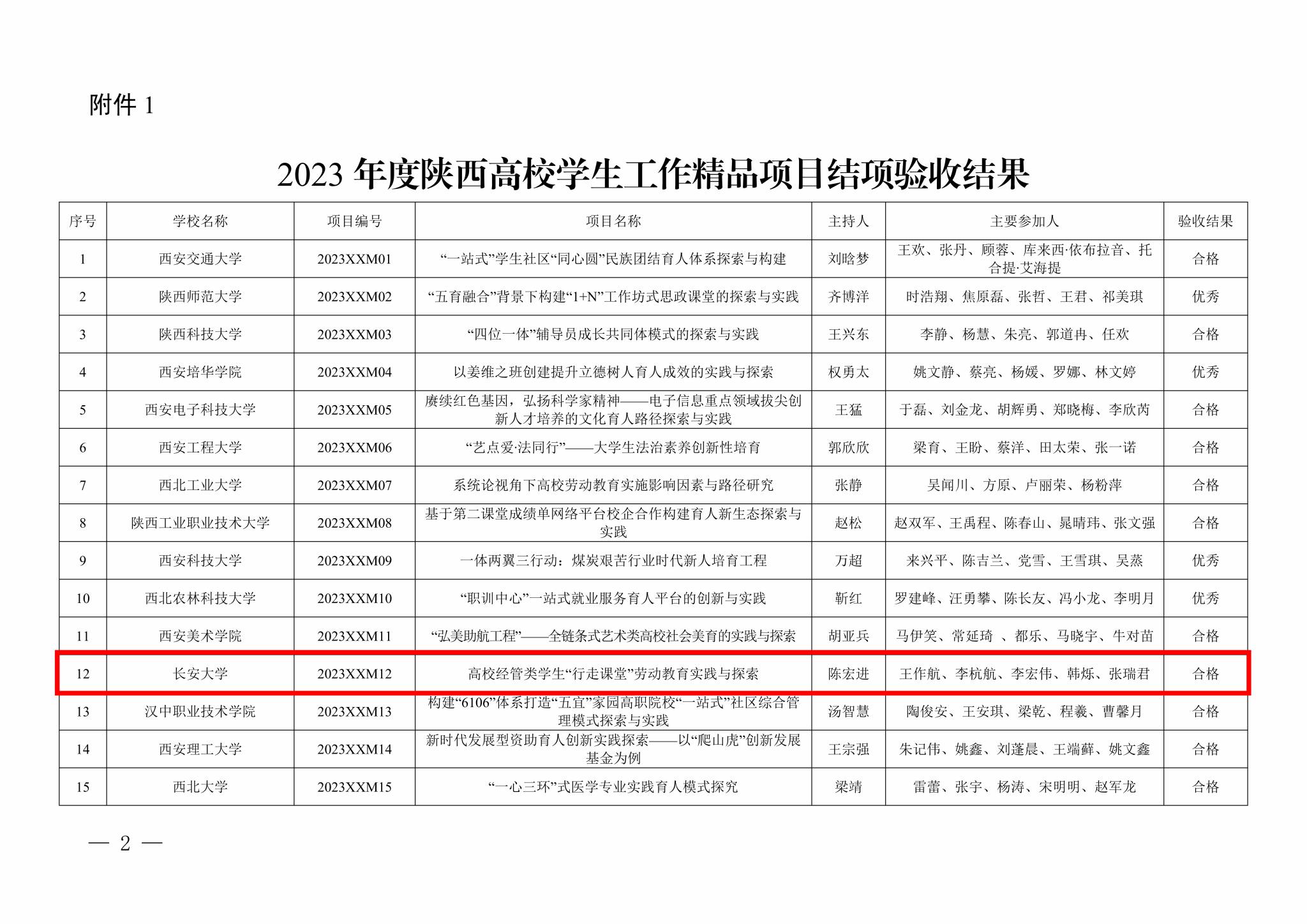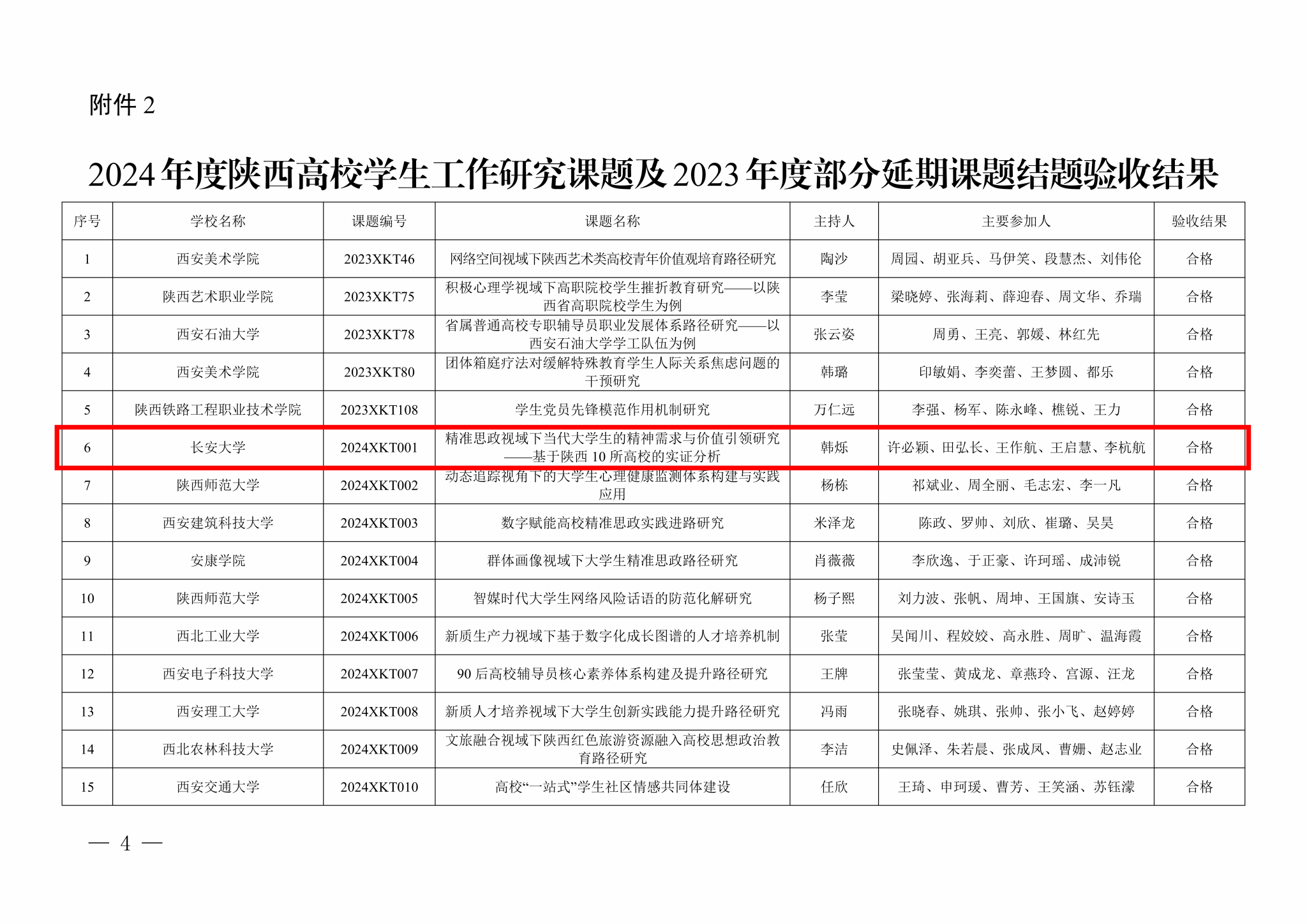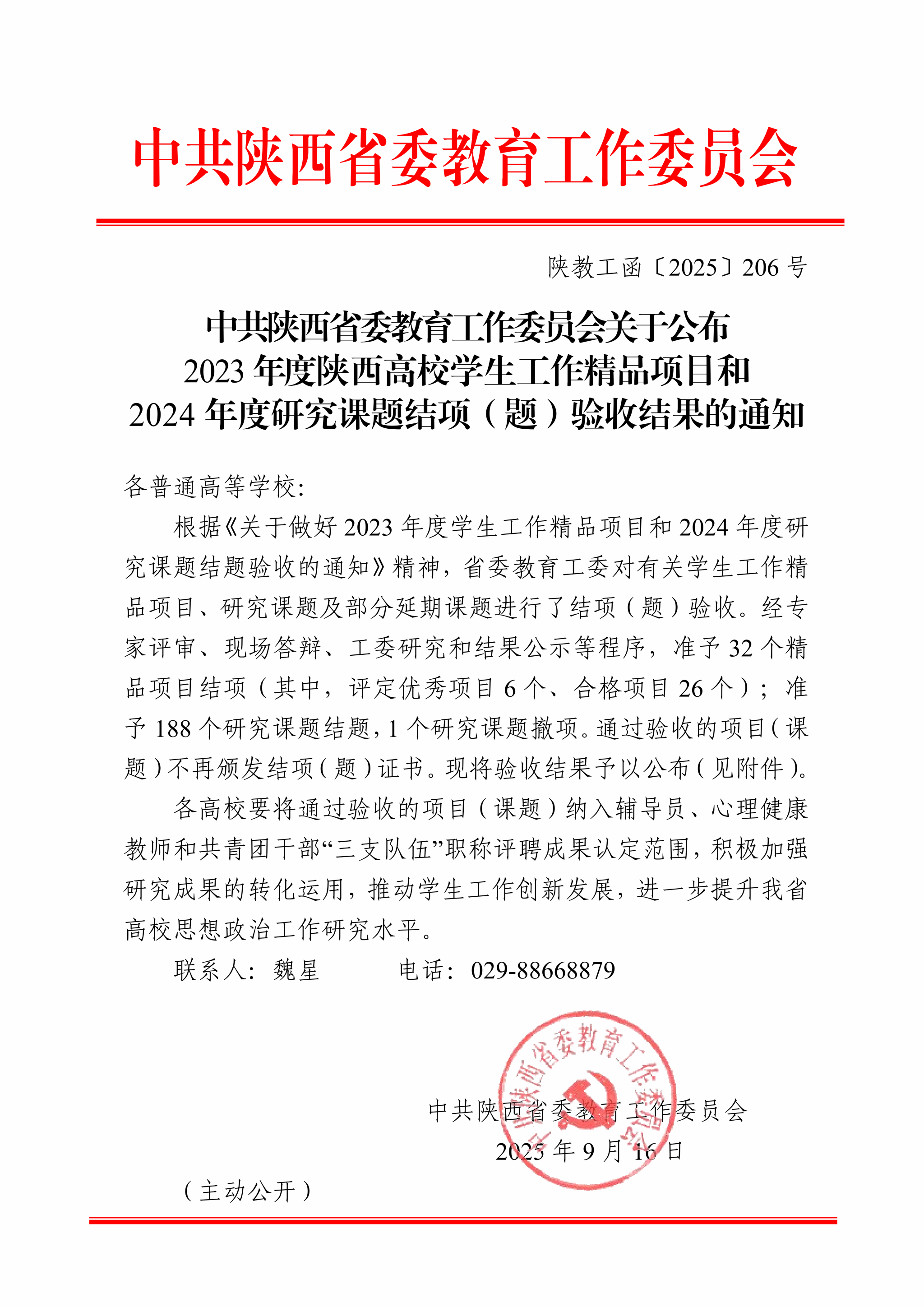 近日,中共陕西省委教育工委发布《关于公布2023年度陕西高校学生工作精品项目和2024年度研究课题结项(题)验收结果的通知》,经专家评审、现场答辩、工委研究和结果公示等程序,我校陈宏进主持的《高校经管类学生“行走课堂”劳动教育实践与探索》通过了2023年度陕西高校学生工作精品项目结项验收,韩烁主持的《精准思政视域下当代大学生的精神需求与价值引领研究——基于陕西10所高校的实证分析》、袁宁波主持的《大学生数字素养的现状测度、影响机制及提升策略研究》和王妍主持的《高校发挥开学典礼、毕业典礼思想政治教育的功能研究》通过了2024年度陕西高校学生工作研究课题结题验收。